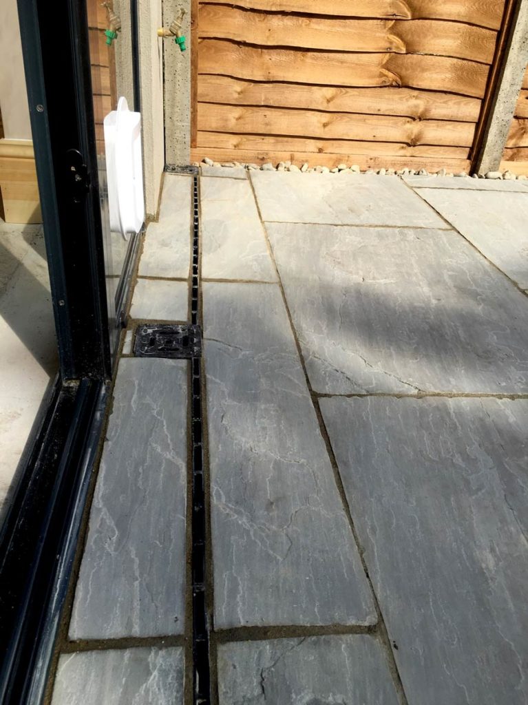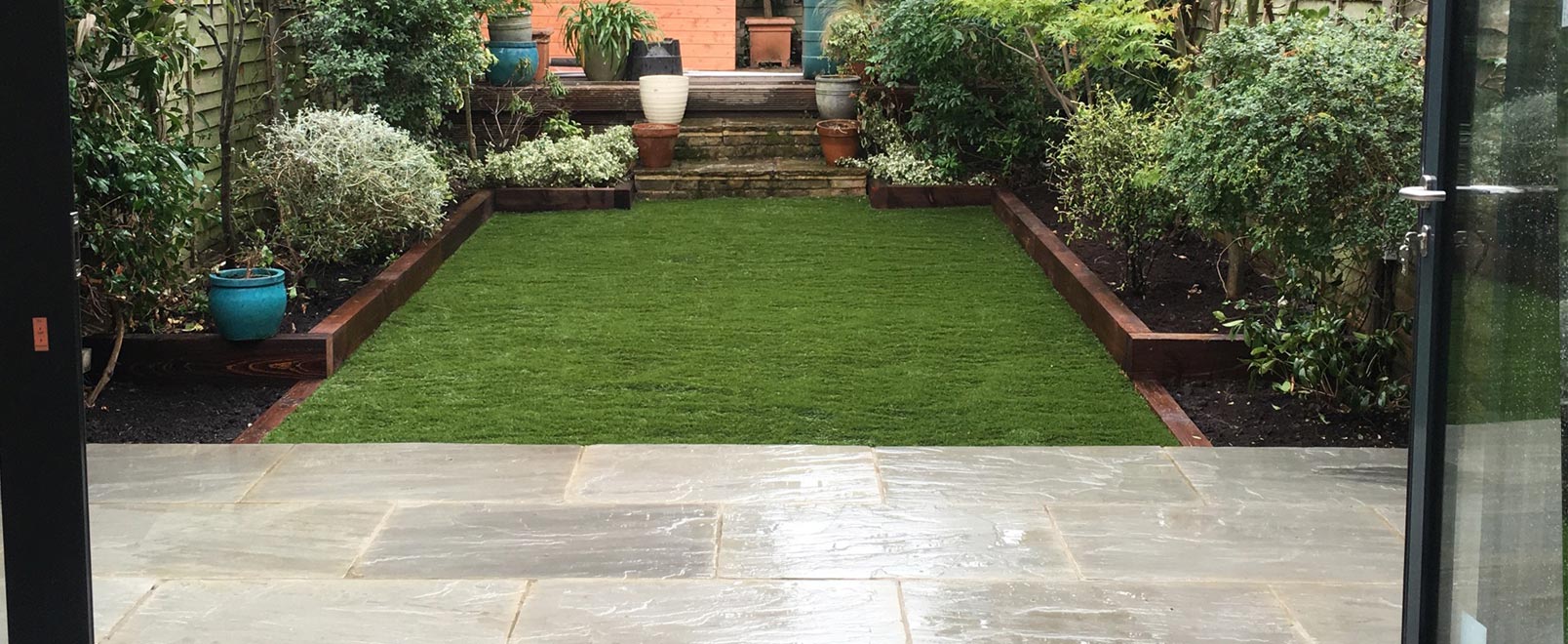 The old decked area was replaced with Castle Grey Riven Sandstone paving, complete with integrated drainage, offering a smooth progression from interior to exterior. The once overgrown, shaded back garden with damaged turf was replaced with an artificial lawn bordered by new raised sleeper beds and a more manicured planting plan.
