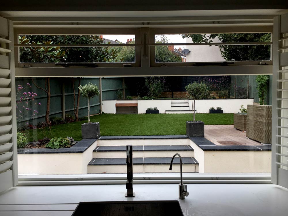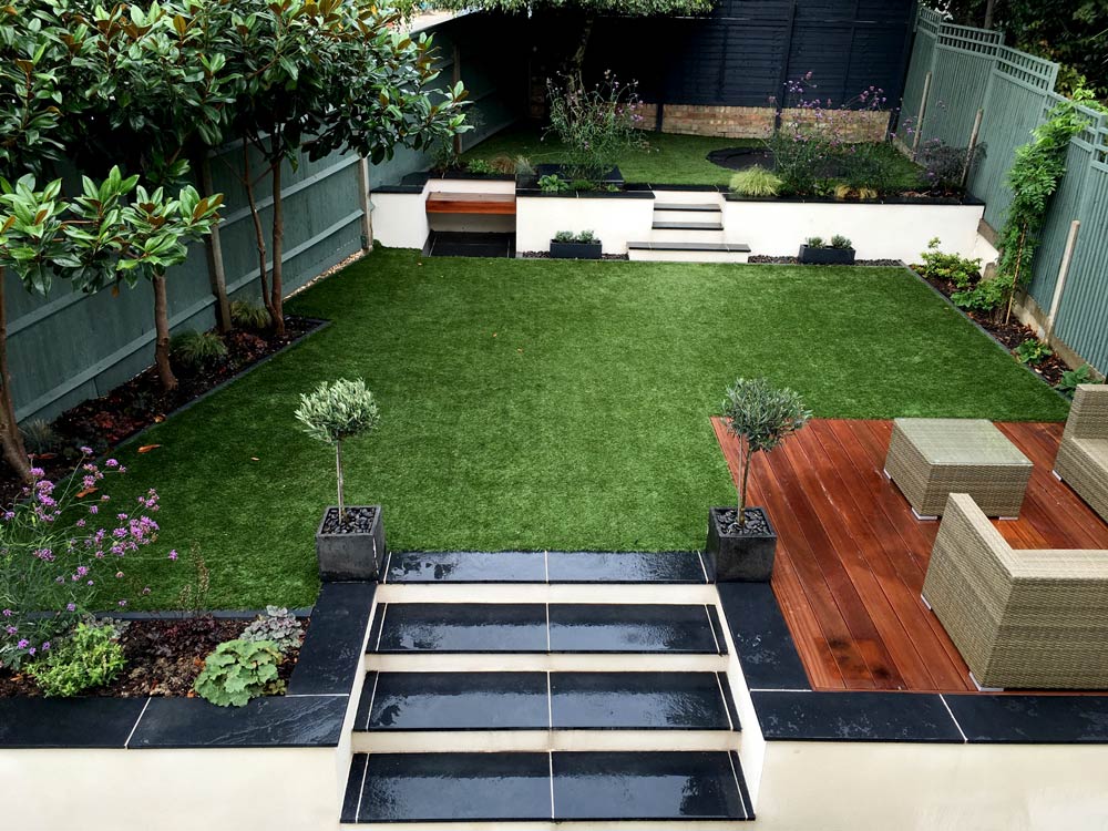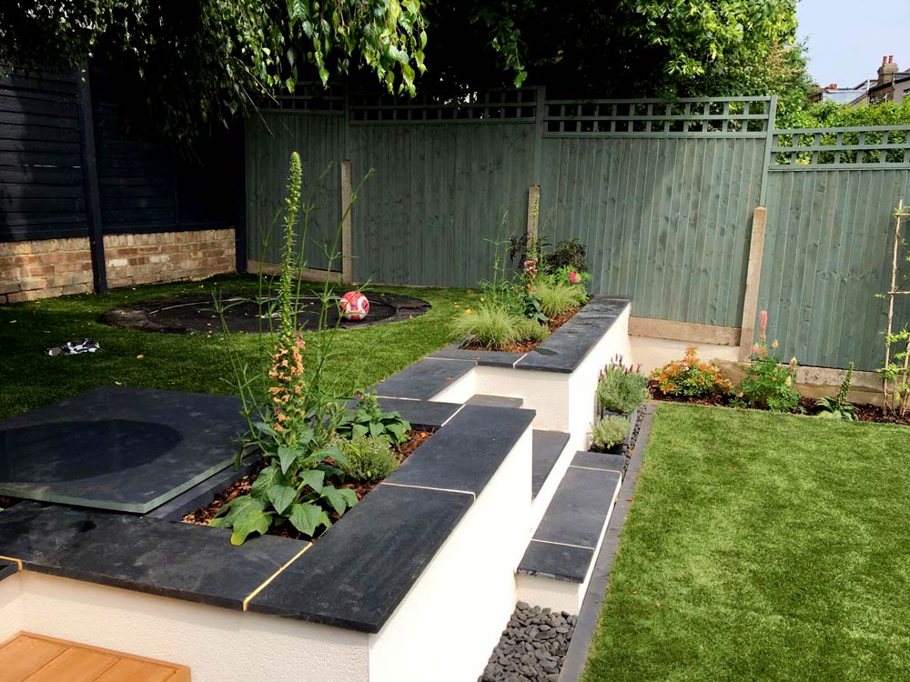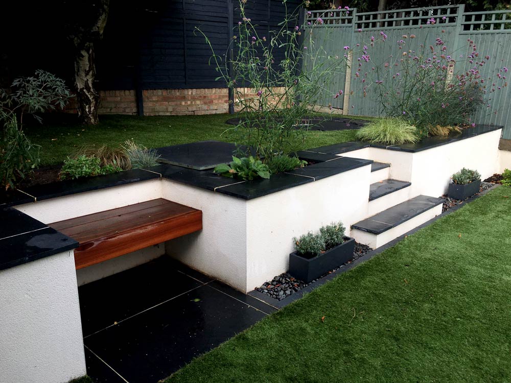 Designed from scratch, this garden was transformed from an over-grown three-tiered space to a beautiful, high spec garden. The larger end section of the garden was excavated and reduced to make a longer multi-purpose mid-section. Whilst the back section was transformed to a children’s play area – complete with sunken trampoline and hidden sandpit (with bespoke camouflage all-weather cover) – the middle section became an attractive green space complete with yellow belau decked seating area. New polar-white K-Rend walls with black limestone capping, were erected comprising two new flights of midnight black limestone steps and an integrated yellow belau hardwood bench.