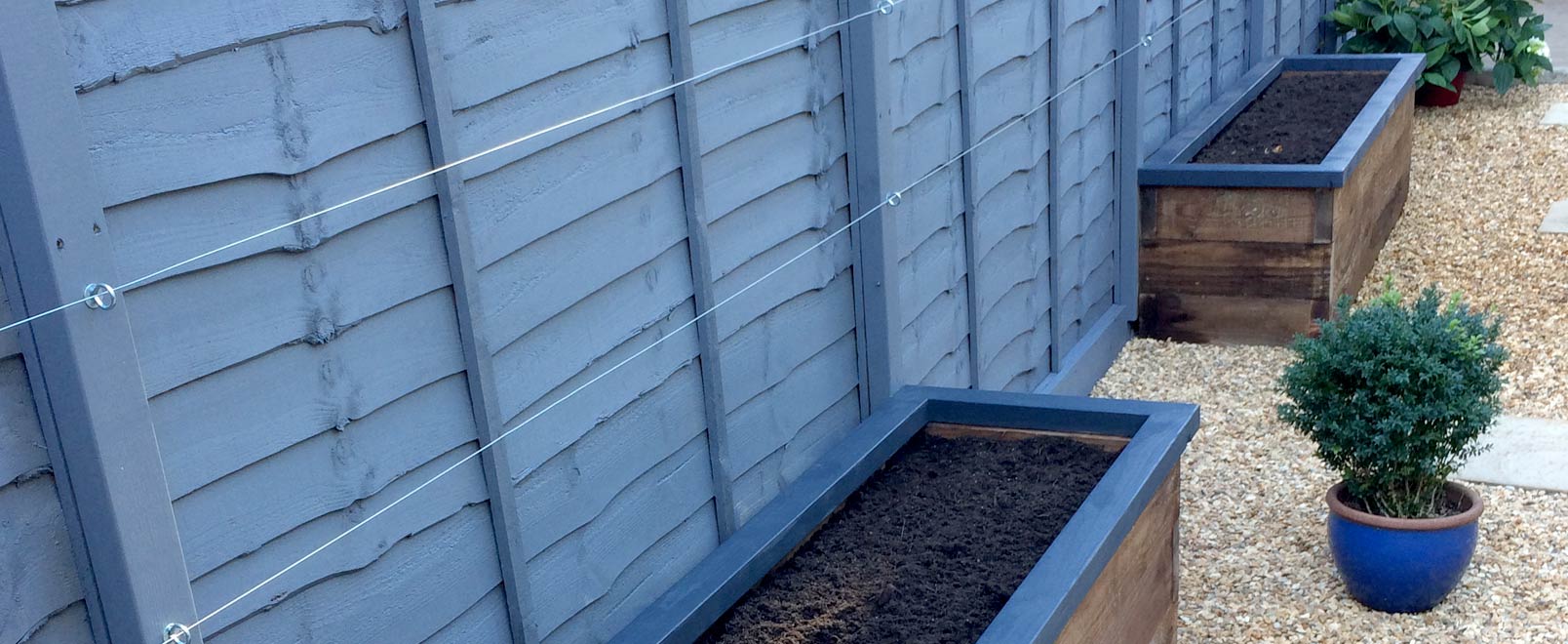 Yellow Balau decking was installed to lead from the kitchen doors to a sea of golden corn gravel, broken up with islands of Sandstone paving. Raised planters constructed from Tanalised 6×2 timber with 3×2 Urban Slate painted capping were built to border the space. A bespoke trellis was built near to the kitchen doors and the fencing was painted in Cuprinol Garden Shades “Silver Birch.”