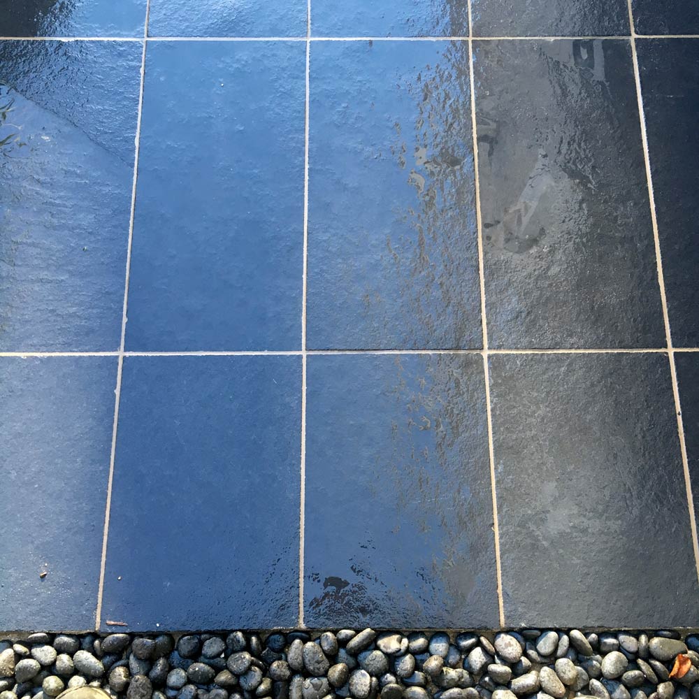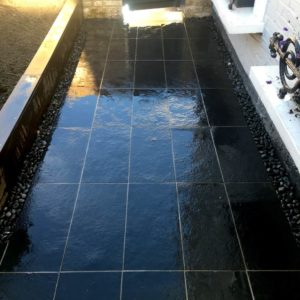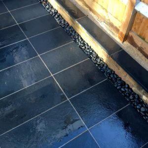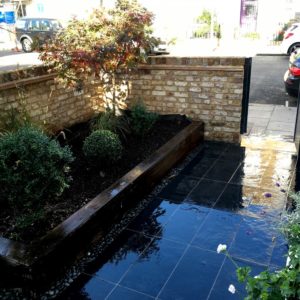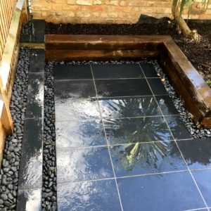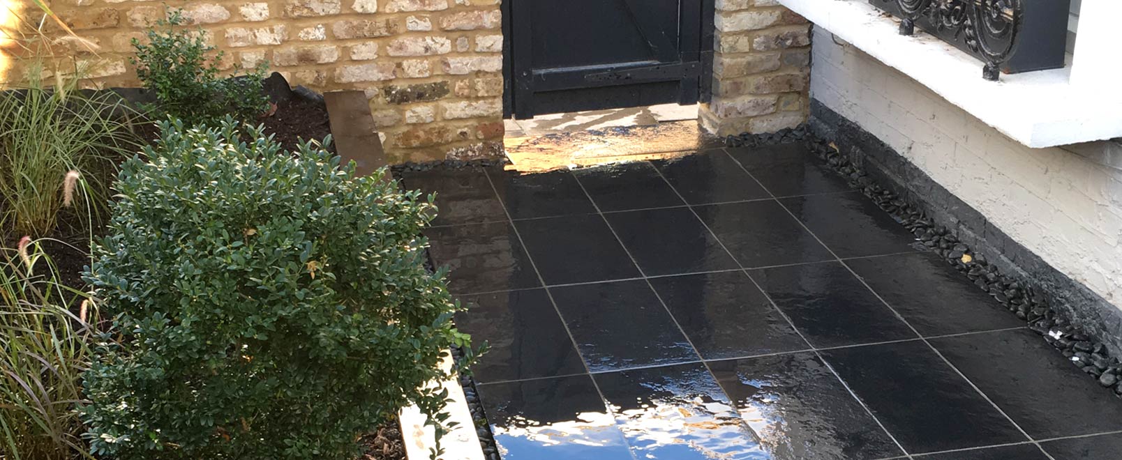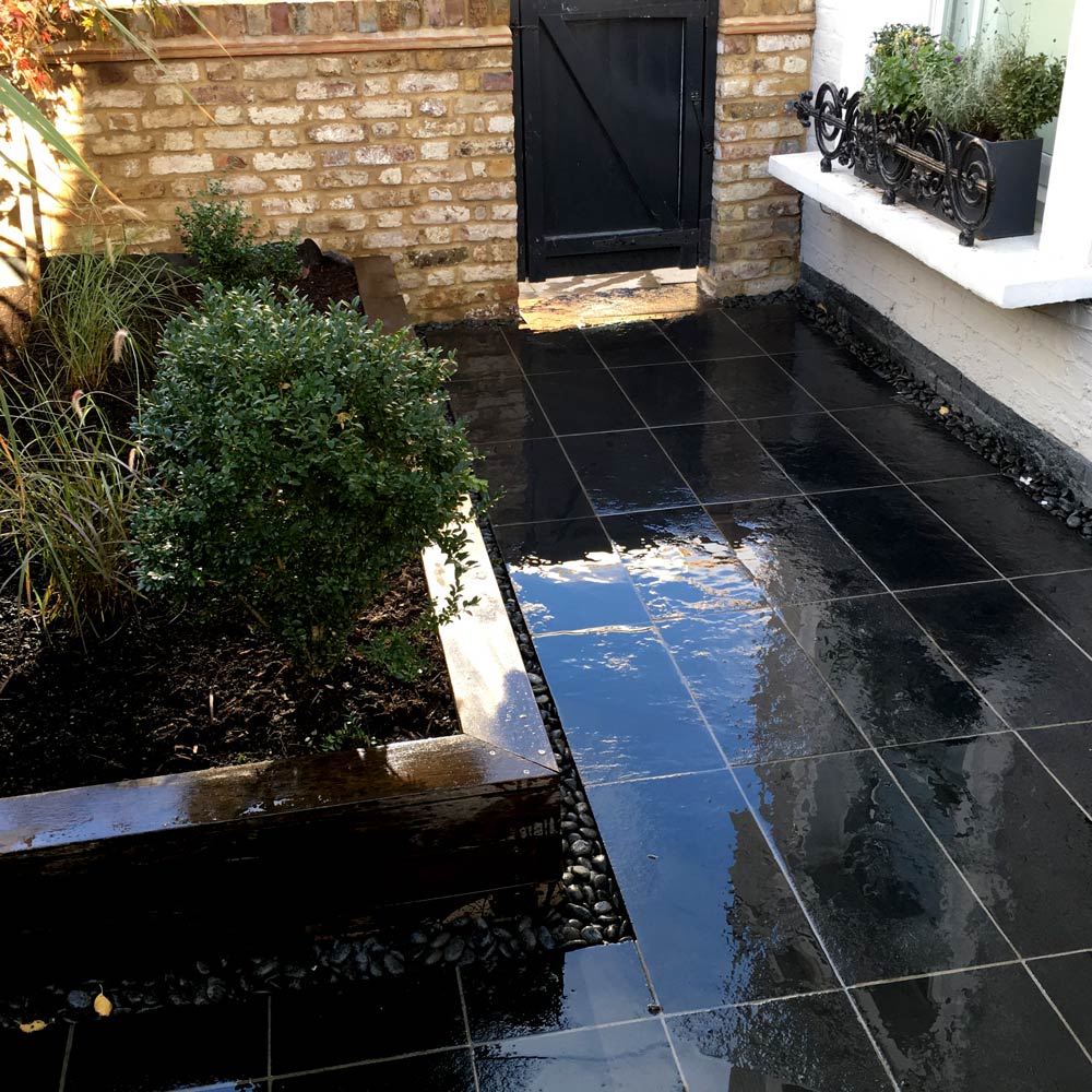 The old Yorkstone paving was replaced with midnight black limestone paving, which was sealed and intensified to offer a high-quality finish. Built around the existing raised beds, the paving was bordered with black polished pebbles.