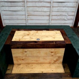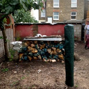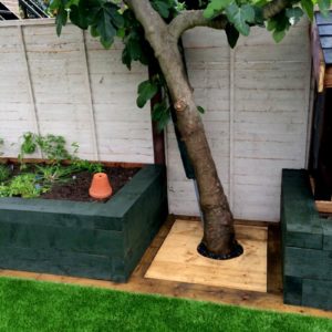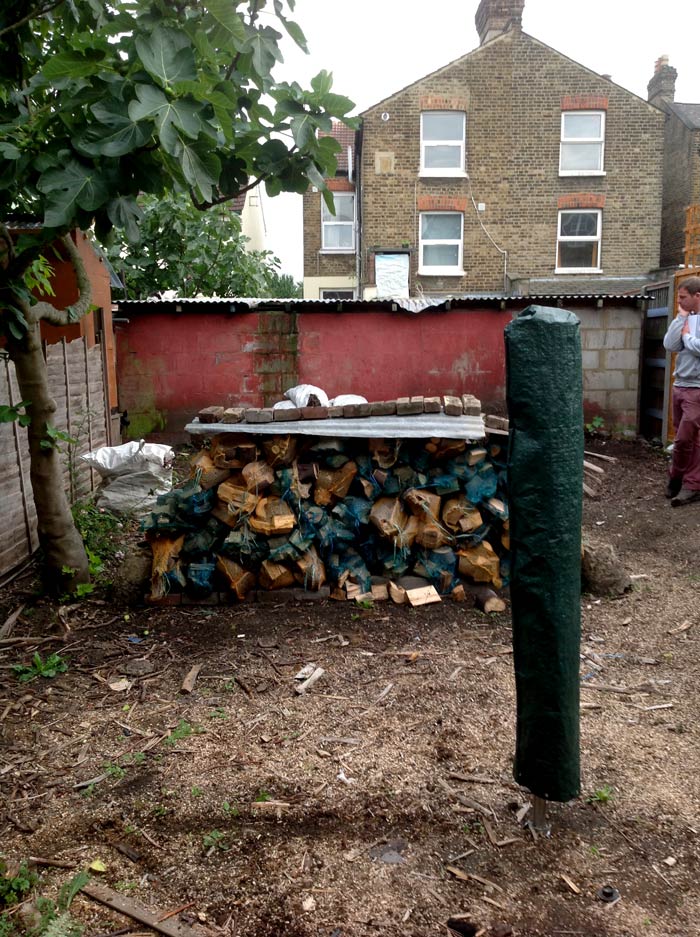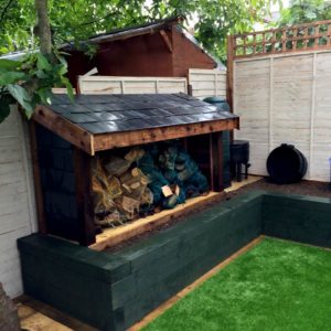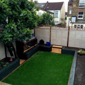 After clearing and levelling the entire space, we installed: scaffold-board decking; artificial lawn; bespoke slate-roof wood store; raised sleeper-beds with integrated storage bench. A new fence was erected along the back of the garden and scribed decking was built around the existing fig tree.